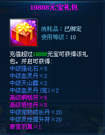 新手礼包(20级)×1、初级生命药水×20、初级法力药水×20、腾云符×3、初级血灵丹×1、初级天山露×1、初级血灵丹(宠)×1、初级宠物成长丹×2 |