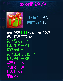 【活动内容】凡进入游戏与第一个NPC泉仙儿对话后,即可获得价值1888元宝的新手礼包。
