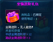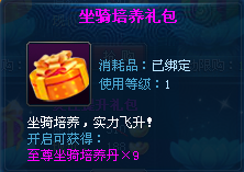 新手礼包(50级)×1、初级坐骑进阶符×2、中级宠物成长丹×1、中级血灵丹×1、中级天山露×1、中级血灵丹(宠)×1、顶级悬赏令×1、初级强体(宠)×1 |