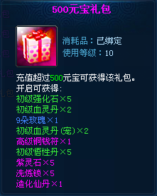 新手礼包(30级)×1、初级生命药水×30、初级法力药水×30、初级宠物成长丹×3、初级强化石×1、绿灵石×2、低级宠物口粮×2、循环灵石×2 |