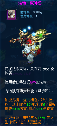 总共可恢复宠物800000点生命值,每10秒恢复一次生命值,每次恢复的生命值与等级有关 |