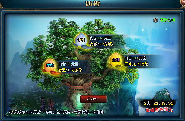 【活动内容】新角色创建后3天内成为VIP的玩家,将可以在30天内,通过游戏右上方“仙树”图标每天对仙桃进行一次采摘,获得超额的富贵回报。