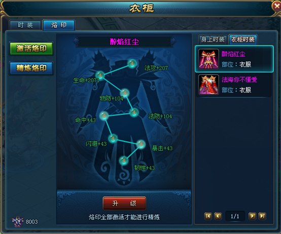 2)每件时装都有8种烙印,分别是物攻(法攻)、生命、物防、法防、命中、闪避、暴击、韧性烙印