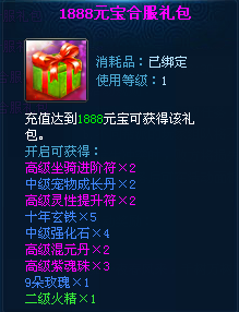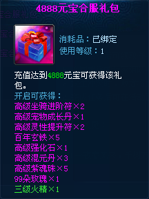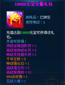 【活动内容】活动时间内,累计充值元宝总数达到以下数量的玩家可额外获赠对应的累充奖励,每个档次最多可领取1次。累计充值49888元宝可领取所有奖励。