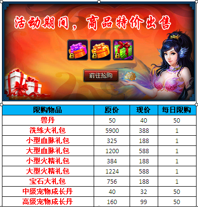 活动期间,以上列表通过元宝购得的道具,皆为绑定。