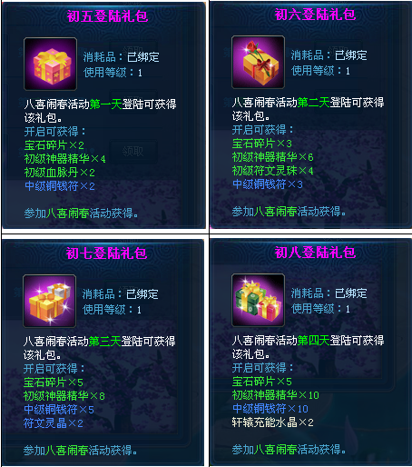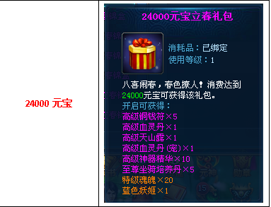 活动时间:活动开启时间为2014年02月04日00:00,相应地,2014年01月28日00:00以后的新开大区不参与此次活动