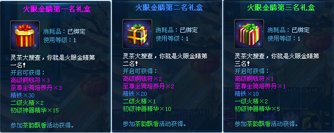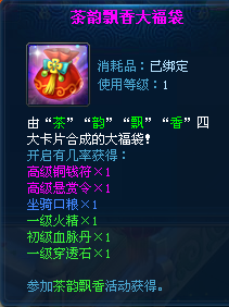 【活动内容】:活动期间玩家打守卫云洲(多人)、幽冥地狱(多人)、龙王窟(多人)和五行神殿(多人)副本,击杀每个副本内的怪物可分别收集“茶”“韵”“飘”“香”卡片,收集后可以在炼炉处合成礼包奖励。