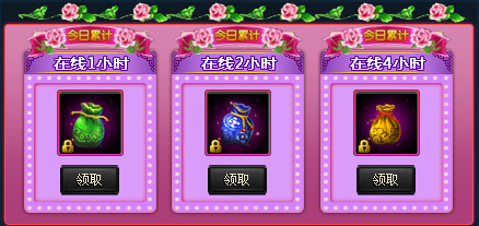 【活动内容】:每日玩家累积在线时间为1小时、2小时和4小时,可获得相对应的奖励。