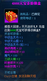 【活动内容】:活动期间累积充值一定数额元宝可以获得相应礼包。