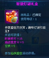 【活动内容】:每日玩家可前往云州城-花灯处答题,答对每道题都可以获得20000绑定铜钱和150000经验,连续答对5道题可获得礼包。每日只有5道题。