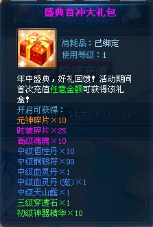 【活动内容】:活动期间充值任意金额即可获得盛典首冲大礼包。