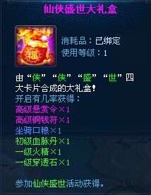 【活动内容】:活动期间玩家打守卫云洲(多人)、幽冥地狱(多人)、龙王窟(多人)和五行神殿(多人)副本,击杀每个副本内的怪物可分别收集“仙”“侠”“盛”“典”卡片,收集后可以在炼炉处合成礼包奖励。