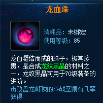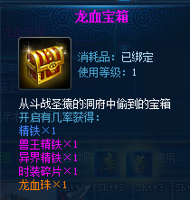 PS: 锁住的龙血宝箱与龙血宝箱锁匙将合成龙血宝箱,将有几率获得龙血珠(龙血凝结而成的珠子,极其珍贵,是合成龙纹黑晶的材料之一,龙纹黑晶可用于70级装备的进阶)!