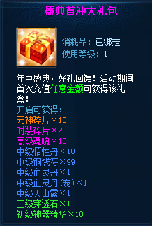 【活动内容】:活动期间充值任意金额即可获得盛典首冲大礼包。