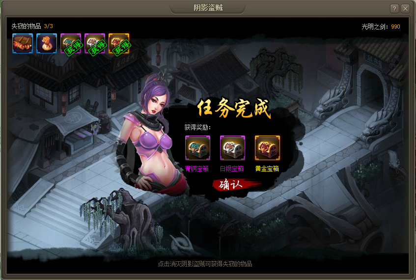 5只胆大包天的阴影盗贼分别从京城财散人处偷取了5个价值不等的宝箱,气愤的财散人委托玩家帮忙教训他们,每成功消灭1只阴影盗贼,就能获得该盗贼的宝箱奖励!