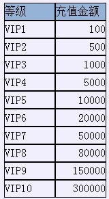 例如:升级VIP3时需要1000金币,所以玩家可以一次性充值1000金币直接升至VIP3,也可以累计充值达到1000金币。