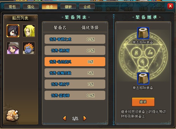 传承系统可以将装备的强化等级转移至另外一件装备上,在提高等级用高级装备替换低级装备时可以节约大量的时间与银币。
