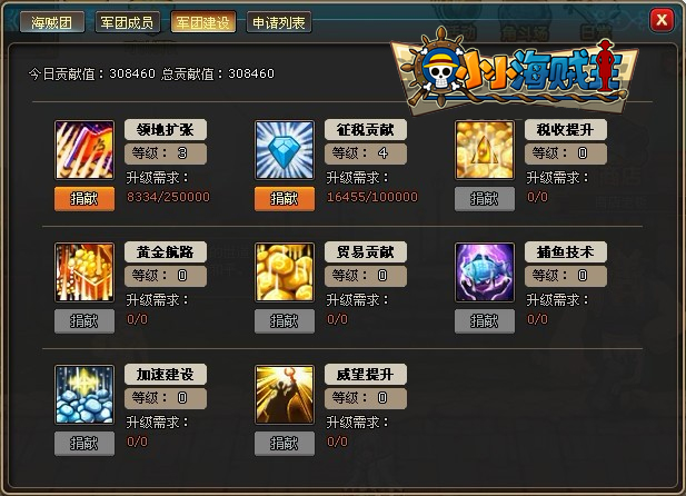 海贼团建设为科技升级制,等级越高对团员的非战斗属性加成作用越明显。