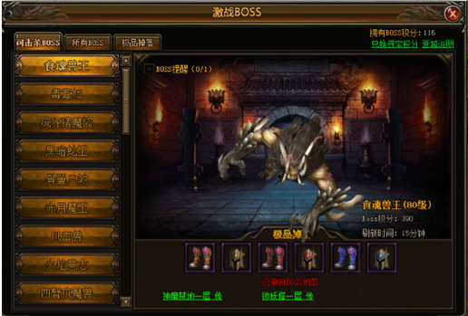 玩家60级以后可通过主界面右上方的激战BOSS图标进入激战BOSS界面。