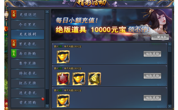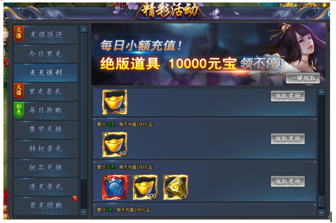 每天返还元宝,指定天数还会返还高级宝石和绝版技能符文