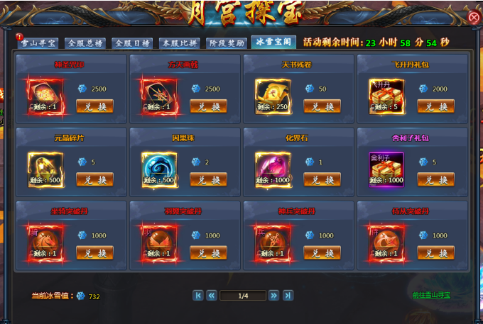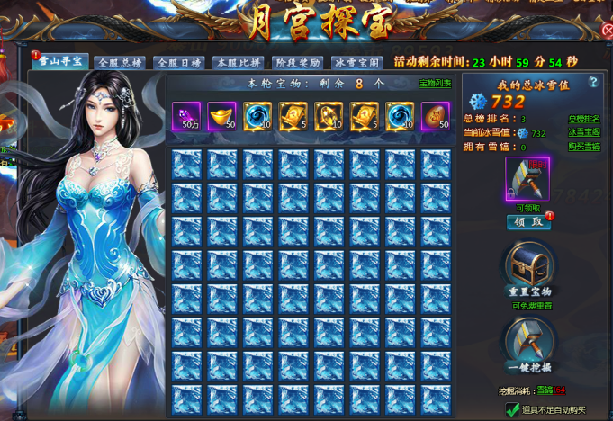 玩家在寻宝界面,每消耗1个雪镐打开冰块,有概率获得积分或者宝物