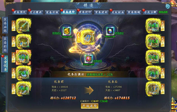 玩家全身红色装备2阶或者等级达到200级可以在装备进阶页签下看到玄金化圣的入口