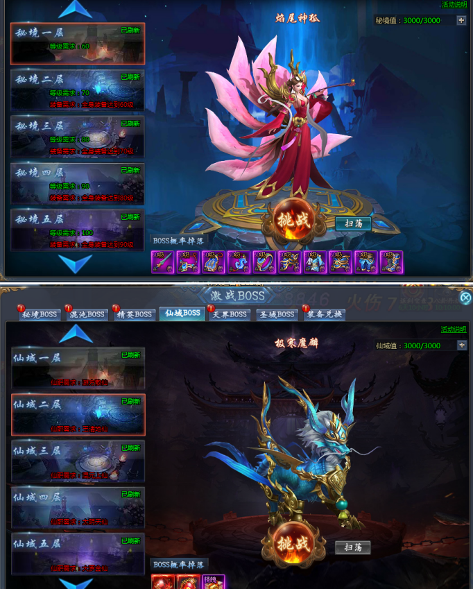 拓展了仙域boss的层数,增加了装备玄金化圣石的产出