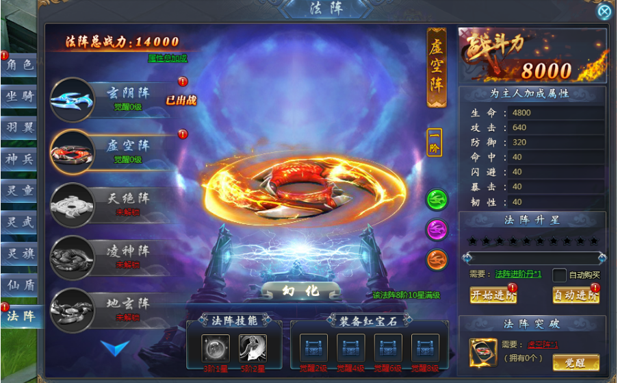 法阵可进行进阶和突破,法阵突破后可镶嵌宝石(与侍从系统相似)