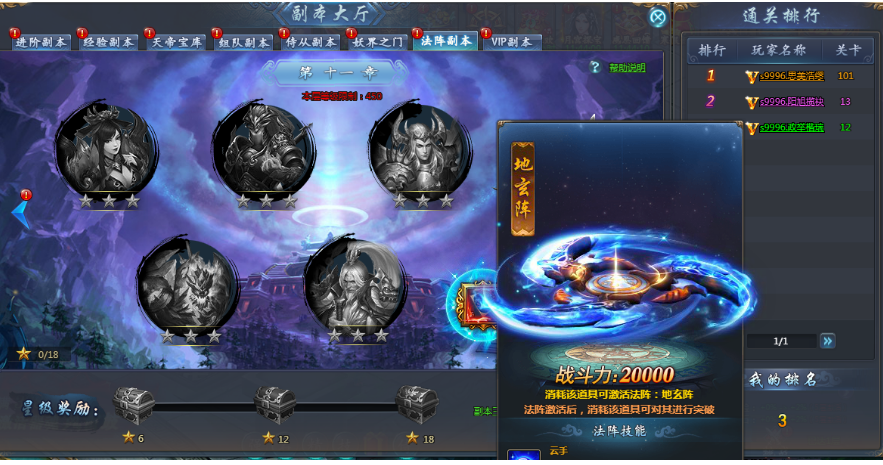 每章节通关完成之后可获得法阵激活道具,三星副本可进行第二日扫荡(与侍从副本相似)