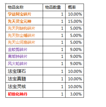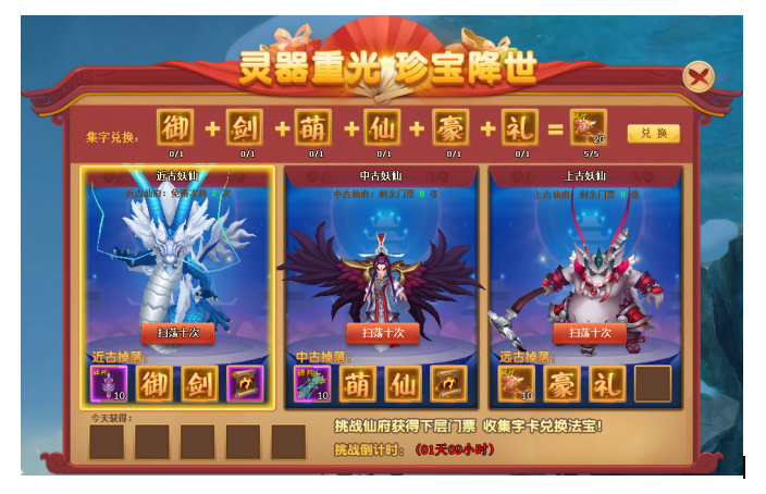 活动内容:击败仙府妖仙获取道具和文字道具,集齐文字道具兑换法宝奖励。