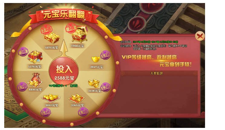 活动内容:投入元宝抽取高倍元宝返利,每次提升VIP等级可以获得一次抽奖机会。