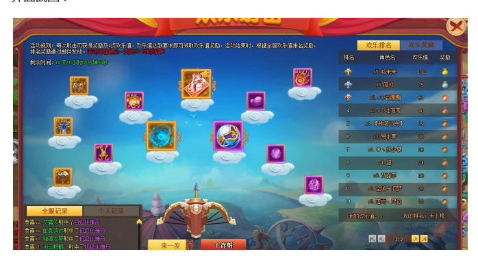 活动内容:玩家消耗箭矢射击各种道具奖励,每次射击可获得奖励及1点欢乐值,欢乐值达到要求可以领取欢乐值奖励,活动结束时,根据全服欢乐值排名奖励。