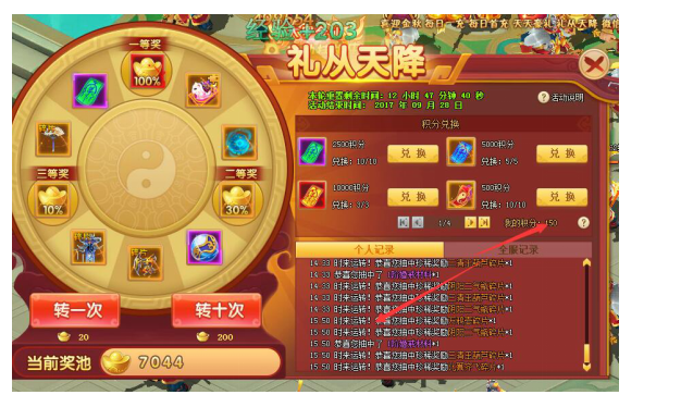 活动内容:玩家花费元宝转动转盘,赢取各种道具。转动转盘同时获得积分,积分可以用来兑换商品。