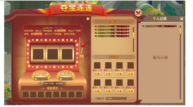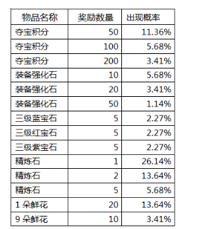 活动内容:玩家消耗夺宝券转动夺宝机,得到相同的图案越多,获得的奖励越丰厚。抽出道具图案有两个相同,则获得两倍暴击,本次所有道具奖励数量为2倍;抽出道具图案全部相同,则获得三倍暴击,本次所有道具奖励为3倍。夺宝获得的积分,可以兑换道具奖励。