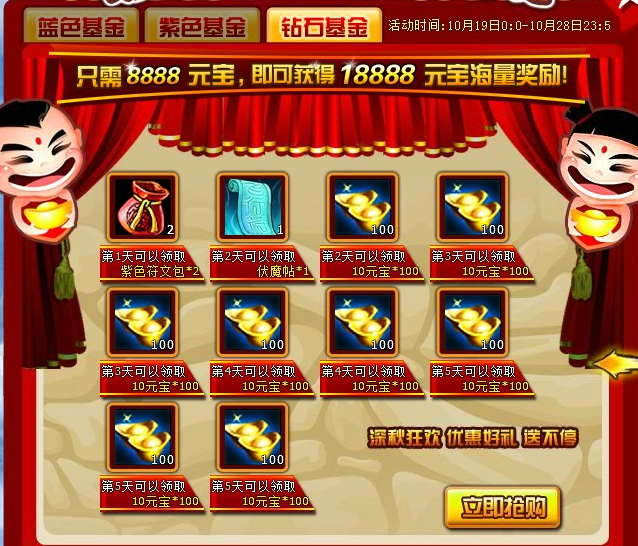 活动规则:活动期间,每日消费大回馈,只要累计消费达到一定额度,即可获得奖励,最低只需消费100元宝哦,天天消费,天天有奖。(每个梯度奖励每天仅可领取一次,0点后重新计算消费额度)每日消费额度 消费奖励