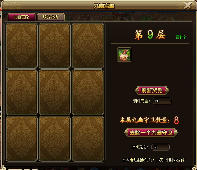 活动规则:九幽宫殿一共有九层,每一层都有九个格子,九个格子里有可能有各种奖励和守卫,翻到守卫就得从第一层从头开始。当然,你可以使用元宝更换奖励和去除守卫。
