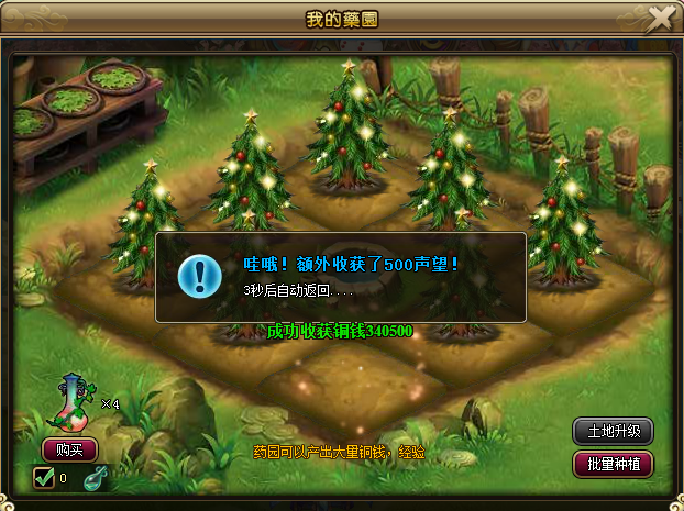 1、活动期间种植摇钱树或者经验树时会变成圣诞树,收获圣诞树时除了可获得大量铜钱或者经验外还可获得额外的声望哦,颜色等级越高的圣诞树收获的声望越多!(任何颜色的摇钱树或者经验树都会变成圣诞树)
