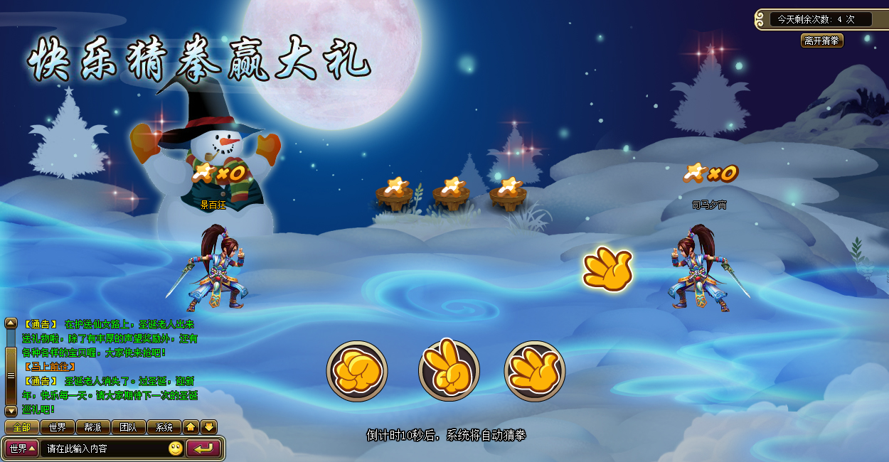 活动规则:活动期间,玩家每天可参与5次快乐猜拳赢取圣诞星星,使用圣诞星星可获得10体力,活动结束后,连胜排行还有丰厚奖励哦!