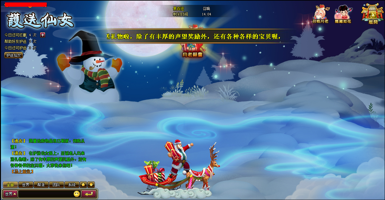 活动规则:1、跨服提交圣诞雪球满5W个,全服每个参与提交雪球的玩家都可获得圣诞欢乐礼包一个,每提交30个雪球可获得圣诞袜一只。