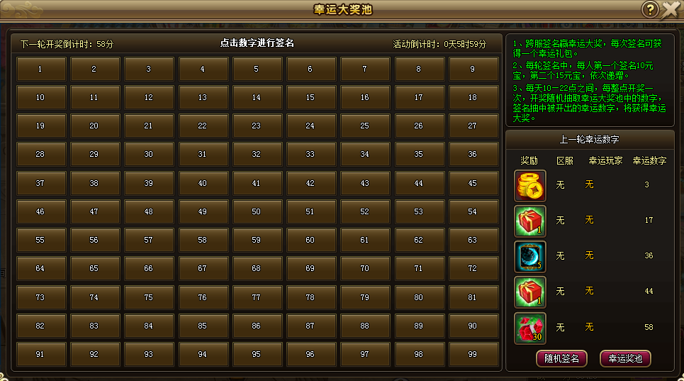 活动规则:1、跨服签名赢幸运大奖,在幸运大奖池点击数字进行签名,被签名的数字将是你的幸运数字。