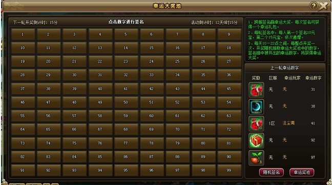 活动规则:1、跨服签名赢幸运大奖,在幸运大奖池点击数字进行签名,被签名的数字将是你的幸运数字。