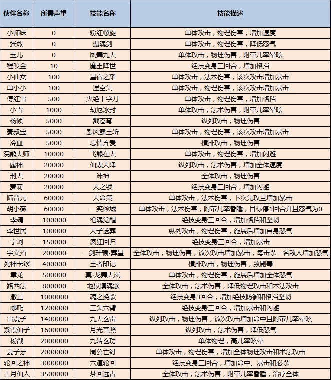 《一剑轩辕》——伙伴技能表