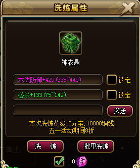 二.法宝洗练 在您装备好的法宝下方有洗练二字 单击即可进入法宝洗练属性界面 法宝最多可以拥有3种属性(激活另外2种属性框需要一定的元宝)而洗练法宝也是需要消耗一定的元宝以及铜钱的。