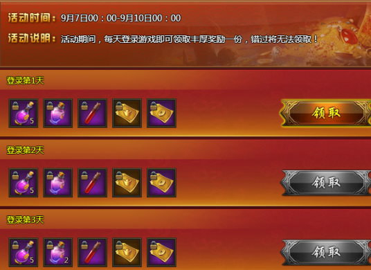 【活动内容】活动期间,每天登录游戏即可领取丰厚奖励一份,错过将无法领取!