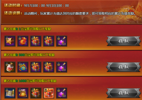 【活动内容】活动期间,玩家累计充值达到对应的额度要求,即可领取相应的累计充值奖励。
