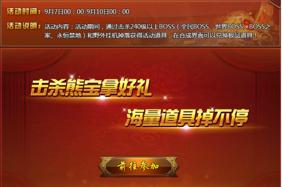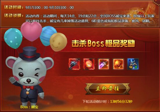 【活动内容】活动期间,每天14点、19点和22点,全民boss熊宝来袭。80级以上玩家可以前往击杀,熊宝有几率掉落活动道具、6阶蓝色戒指和极品装备、披风材料、剑鞘。全民Boss掉落的道具种类根据世界等级变化。
