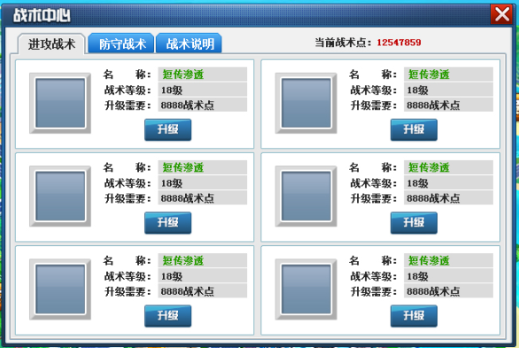 为方便各位战术升级,在更新后玩家可以通过“战术中心”手动选择需要升级的战术,通过消耗战术点来升级。进攻战术和防守战术各6个,共12个战术,所有战术在升级时需要的战术点配置一致。
