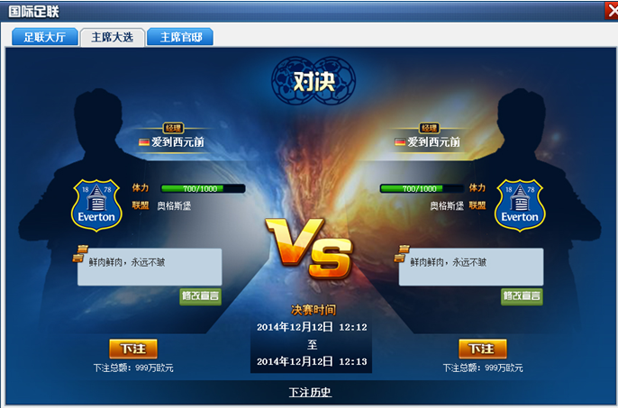 1、国际足联主席竞选决赛开始前可以对竞选双方进行下注竞猜,下注使用欧元,可累计进行下注。