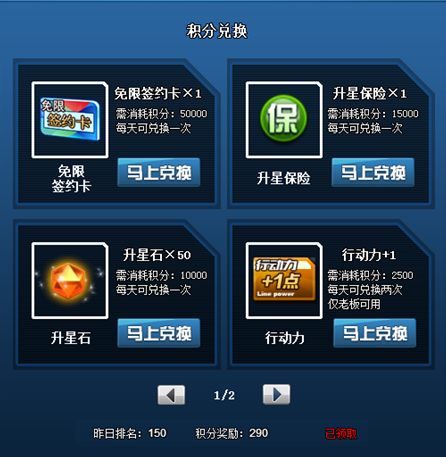 积分可兑换物品更新后增加至6个,分别为免限签约卡、升星保险、升星石、行动力卡、精力点卡及欧元。
