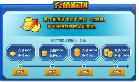 活动期间,各位玩家游戏内的游戏金币累计充值达到一定的数量,即可领取额外金币奖励!
